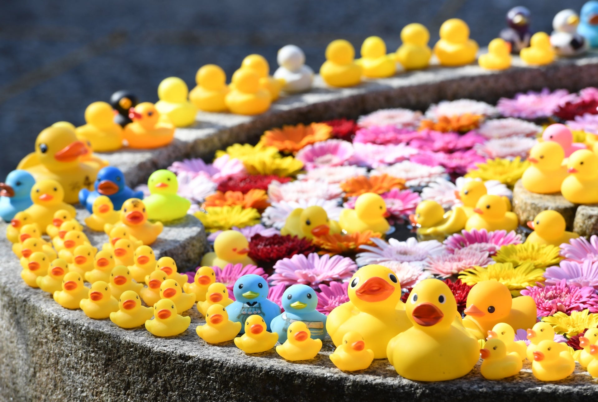 Figure 4. Photo of Awata Shrine’s purification fountain filled with flowers and rubber ducks, 2021 (Source: DragonOne, PhotoAC)