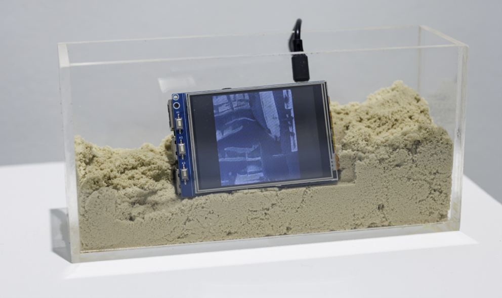 While Dreams of Postmodern Ruins spotlights built (infra)structures, Reclamation and Redemption (2022) focuses on the erasure of natural shorelines. Reclamation and Redemption relates to Chew’s previous work titled Fragment of a Shoreline (2022)—a site-specific installation at the Padang. Fragment of a Shoreline recreated a stretch of Singapore’s coastline in Singapore’s 1843, one that is out of place and out of time. In the same vein, Reclamation and Redemption juxtaposes footage of the city’s coastal transformations brought about by extensive land reclamation through a small LCD screen (see Figure 2). Chew collapses space and time with coastlines appearing as flickering thresholds that destabilises the viewer’s sense of spatial-temporal certainties. In this view, the future is not just a clear temporal horizon, but multi-layered sediments that are malleable.