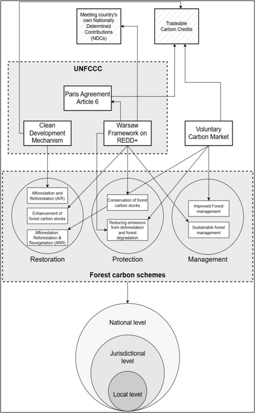 Image 3: Forest carbon schemes comprise a variety of forest interventions, operate under different frameworks for funding and emission reduction, and are implemented at various scales. (Source)