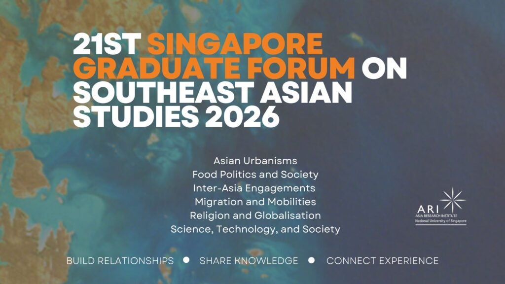 Upcoming Events View Past Events CategoryARI Seminar SeriesCluster SeminarsConferences and WorkshopsLecturesOther EventsStudy Group SeminarsClusterAsian UrbanismsChanging Family in AsiaCultural Studies in AsiaFood Politics and SocietyIdentitiesInter-Asia EngagementsMigration and MobilitiesOthersReligion and GlobalisationScience, Technology and SocietyYear2025202420232022202120202019201820172016201520142013 Results 1 to 8 of 84 - 5 Dec 2025Conferences and WorkshopsExploring the Sacred: People, Place and Power in the Islamic Indian Ocean5 - 6 Jan 2026Conferences and WorkshopsIndia-China Interactions in the 1950s: Texts, Archives, and Concepts15 - 16 Jan 2026Conferences and WorkshopsNew Dynamics in Asia’s Migration Regimes: Global Labour Shortages and Rising Demand for Migrant Workers26 - 27 Feb 2026Conferences and WorkshopsDoing Ocean Governance: Approaches in and from Singapore and Southeast Asia14 - 15 Apr 2026Conferences and WorkshopsMigration and Resilient Trajectories in Asia23 - 24 Apr 2026Conferences and WorkshopsThe Future of Land in Asia: Decolonial Perspectives on Agriculture, Food Sovereignty, and Conservation15 - 26 Jun 2026Conferences and WorkshopsCFA | 21st Singapore Graduate Forum on Southeast Asian Studies3 - 4 Sep 2026Conferences and WorkshopsCFP - Sonic Efficacy: Mantras, Music and Placemaking in Global Southern Asia1